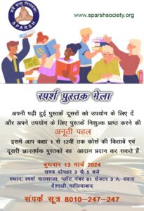 गाजियाबाद, BNM News: स्पर्श सोसाइटी द्वारा अपनी पढ़ी हुई पुस्तकों को दूसरों को उपयोग के लिए देने और अपने उपयोग के लिए पुस्तकें निशुल्क प्राप्त करने के लिए पुस्तक मेले का आयोजन ट्रांस हिंडन गाजियाबाद क्षेत्र के अलग-अलग स्थानों पर मार्च और अप्रैल के महीने में आयोजित किया जा रहा है। इस मेले में कोई भी व्यक्ति कक्षा 1 से 12वीं तक कोर्स की किताबें एवं दूसरी ज्ञानवर्धक पुस्तकों का आदान-प्रदान कर सकते हैं।